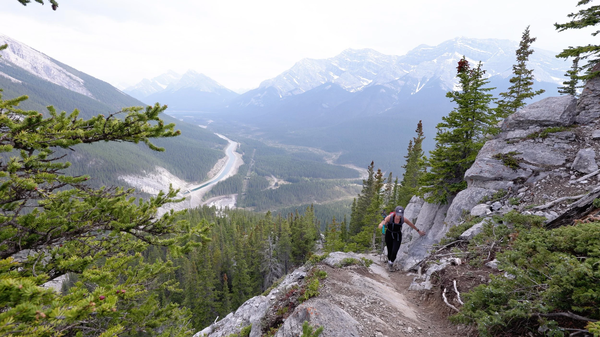 Around half way through your ascent you'll be rewarded with incredibly views of Ha-Ling Peak, a distinctively pointy mountain peak. This peak itself is also hike-able but personally I prefer the views and challenge of EEOR. This view point should only take around 45 minutes to an hour to get to depending on your fitness level.