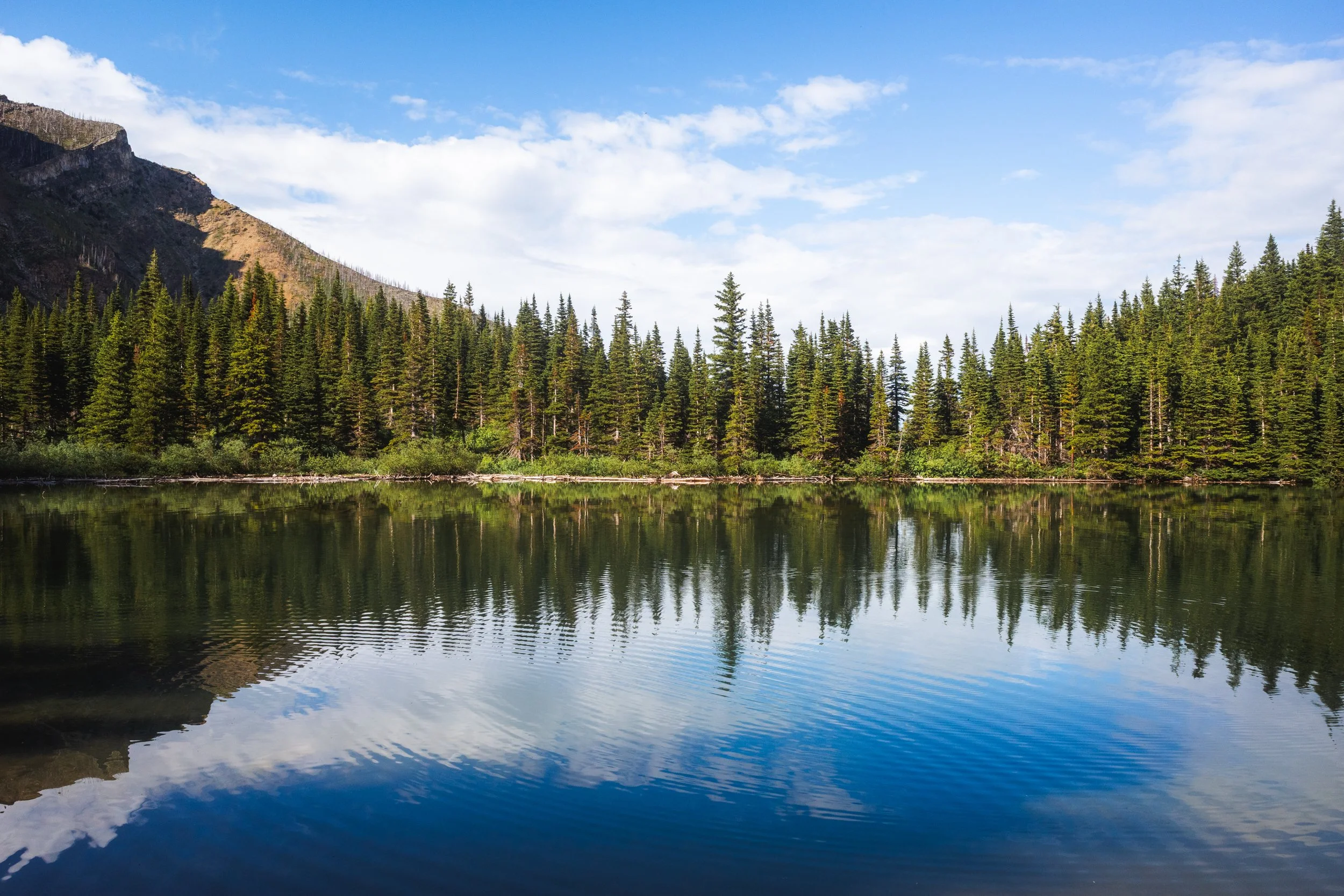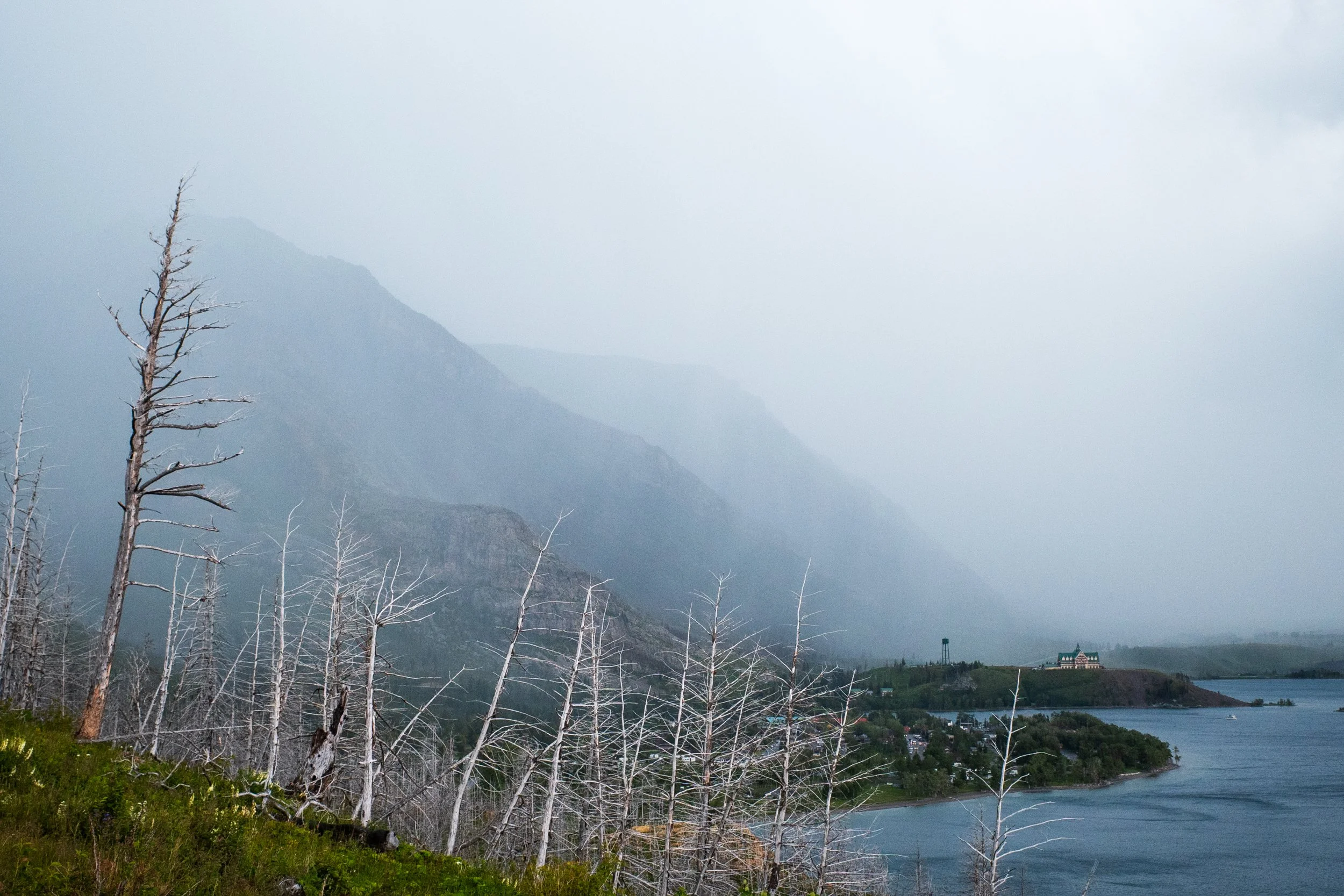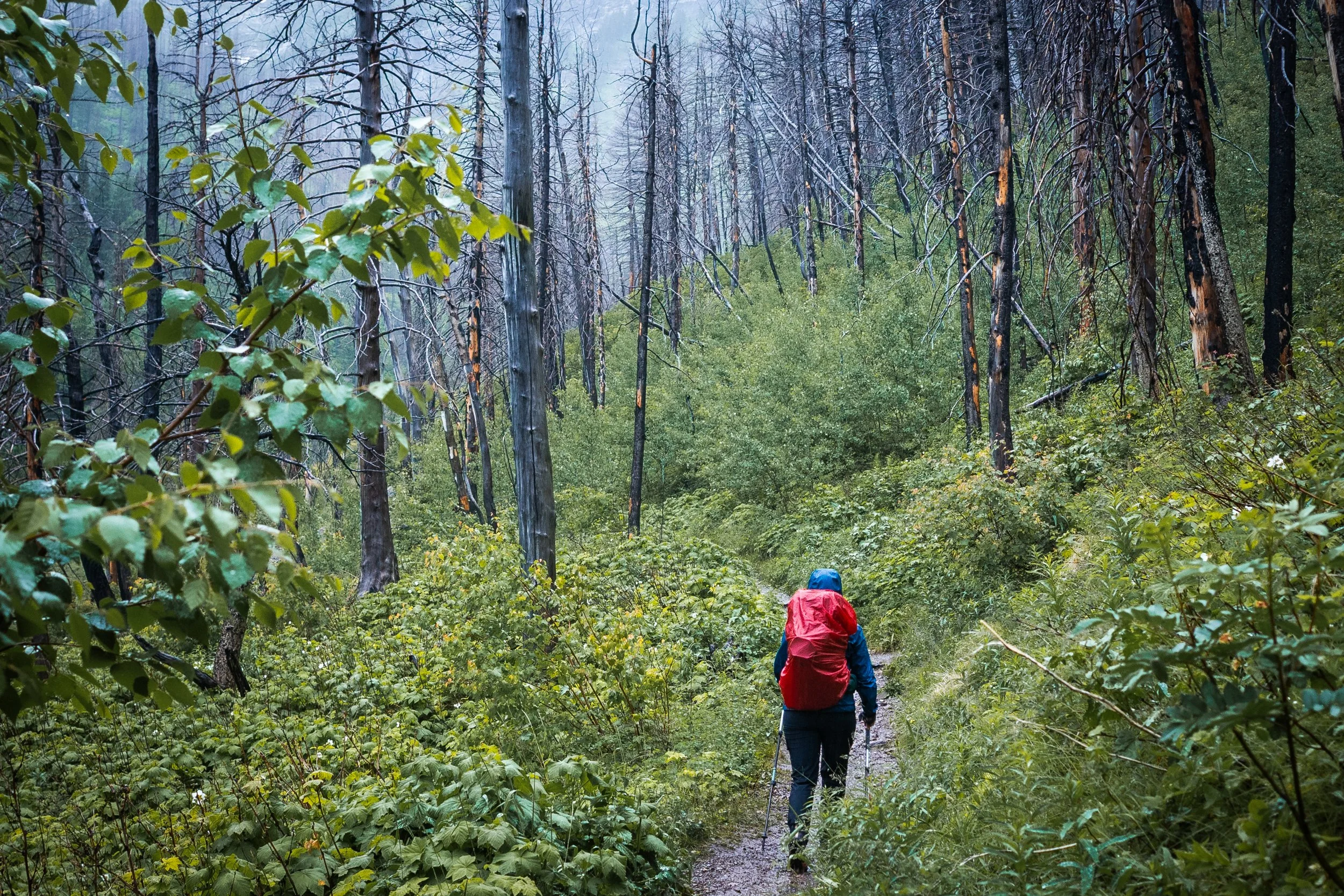 The first 1.4 km of this trail traverse parallel to Waterton Lake with a steady incline of around 100ms of gain. Along this first section you’ll find yourself walking through a stark landscape of scarred trees and dead wood. In 2017 the Kenow wildfire ripped through Waterton burning 38,000 hectares of forest and came close to burning down the town itself.