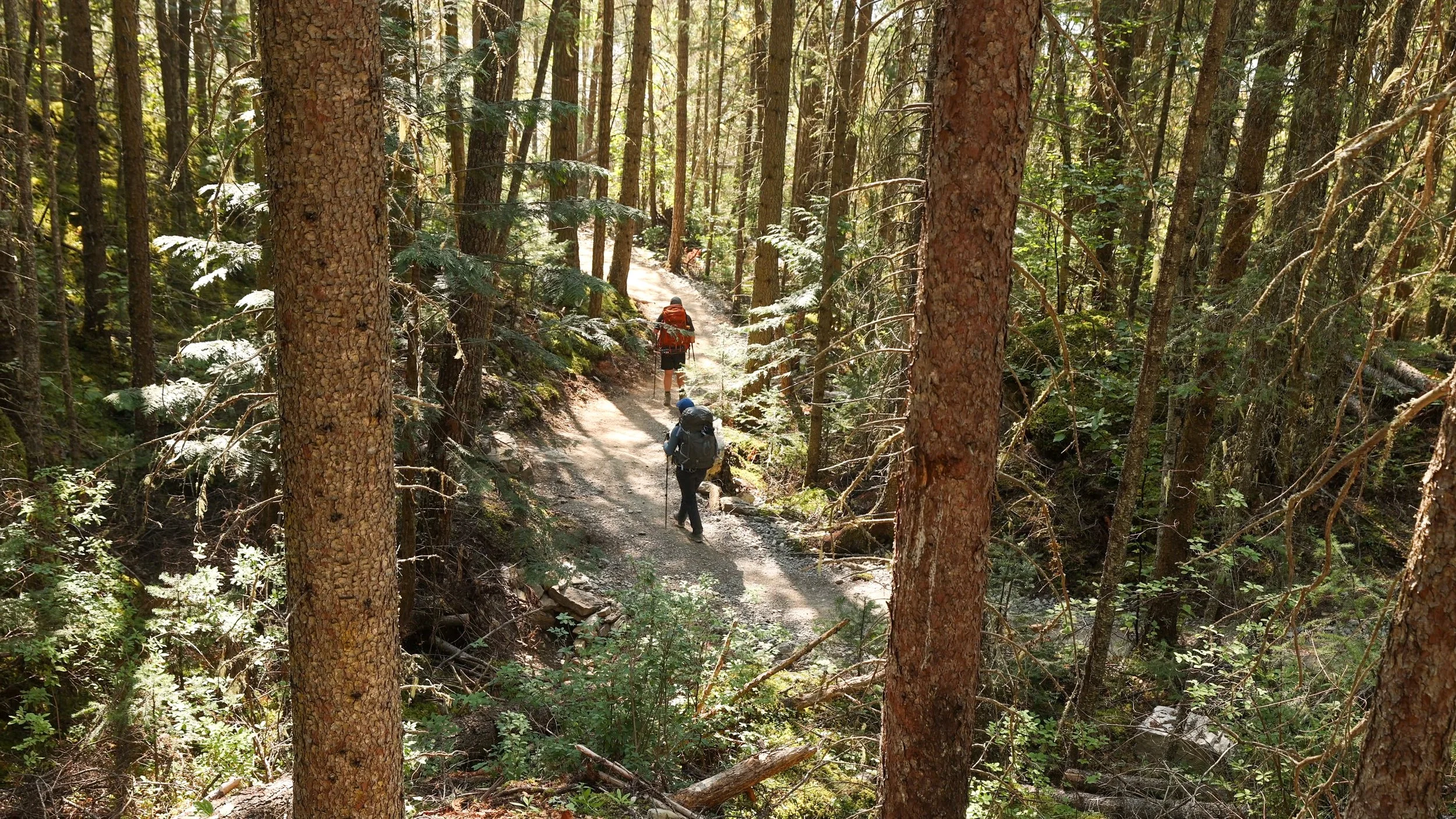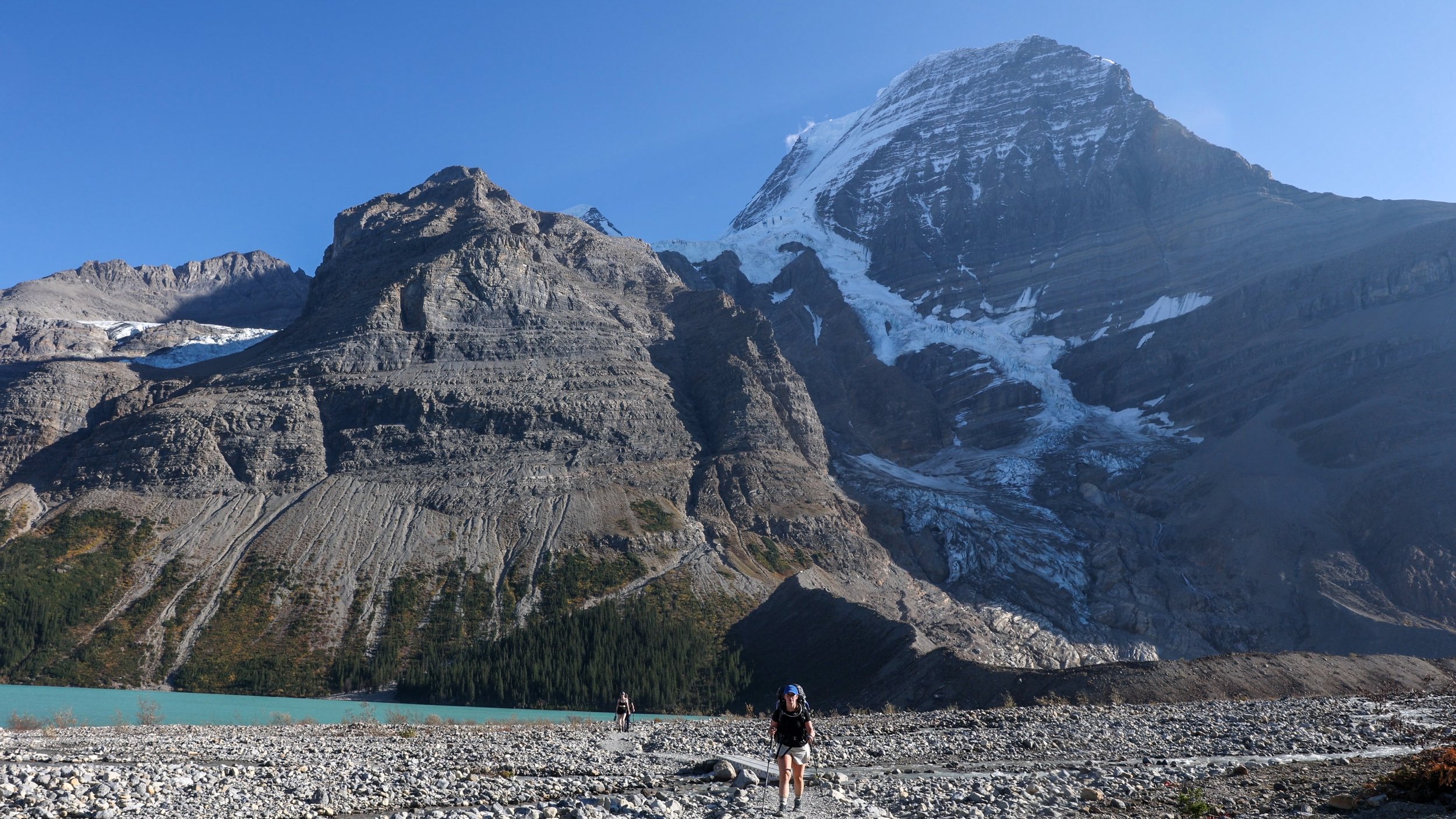 A sunnier day as we hike our way in with Mount Robson in the background.