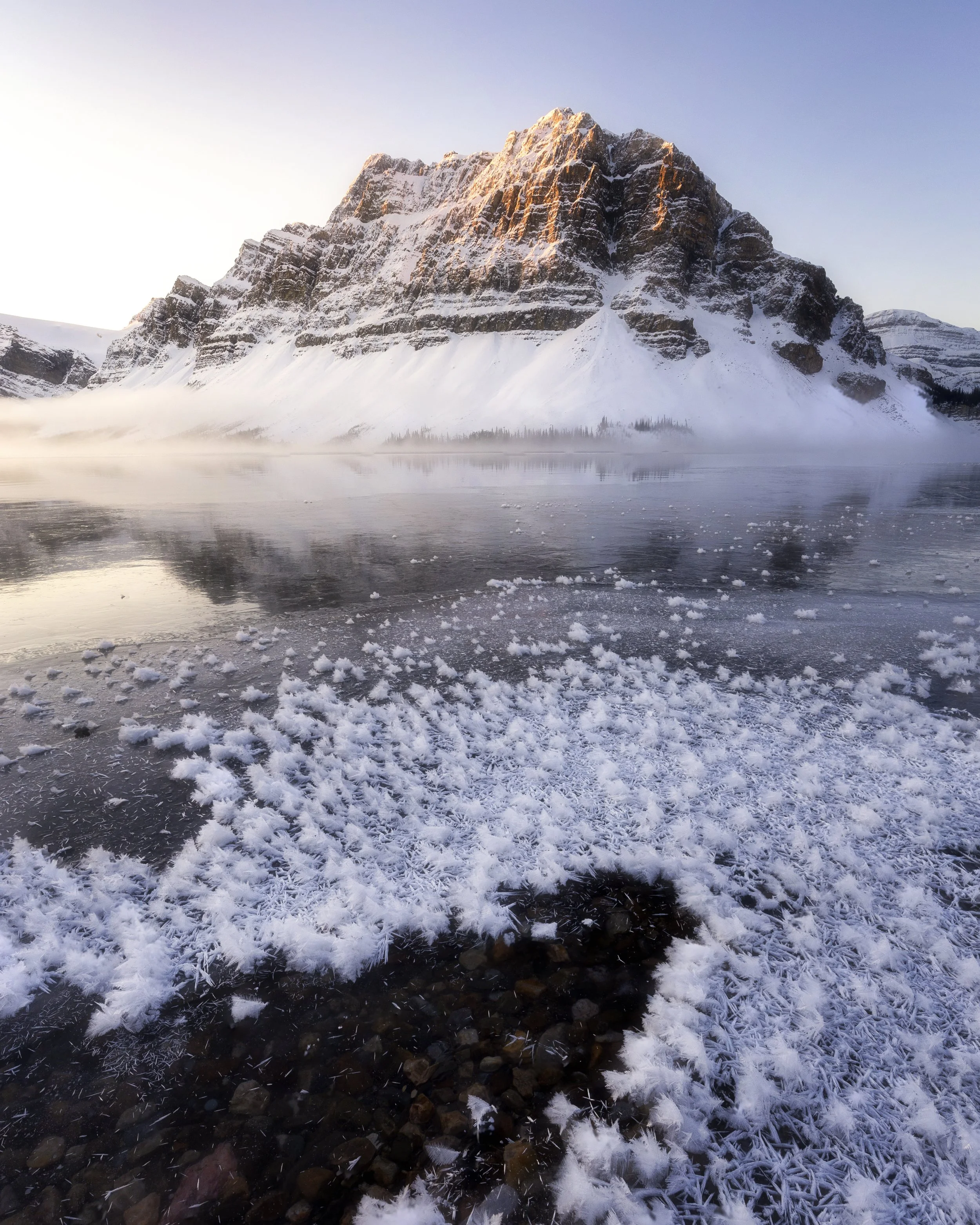 Bow lake is definitely worth a visit when coming to the Rockies at the start of winter. Here you see it as the lake starts to freeze and hoar frost appears, normally a small window before this is all deep under a white blanket of snow.